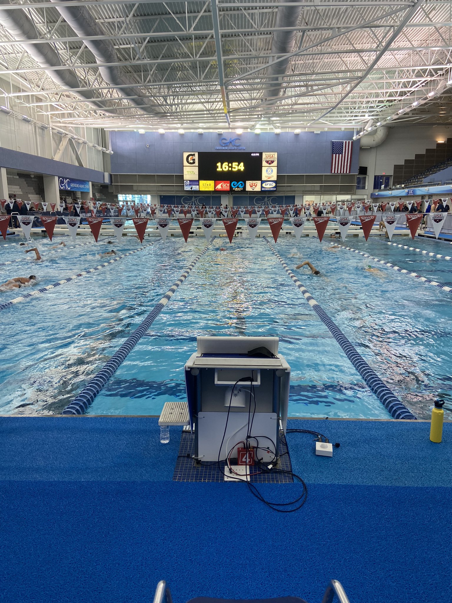 The pool uses pedestal-style blocks with non-turbulent lane lines and an Omega Timing System.